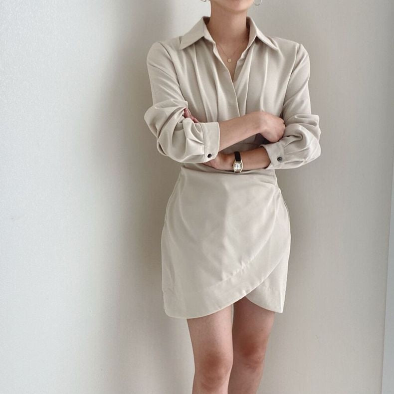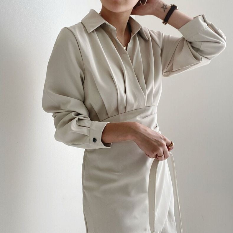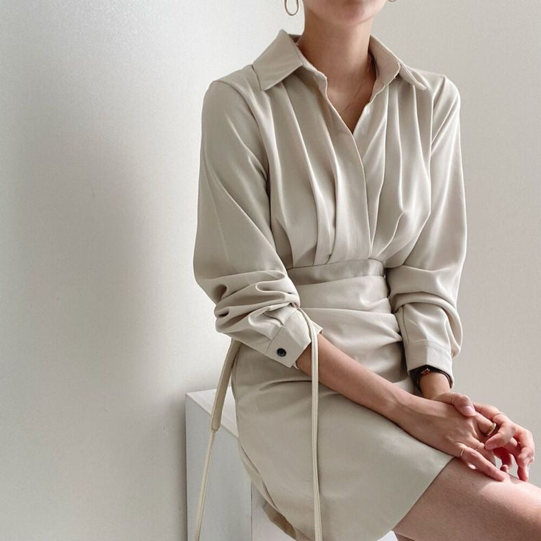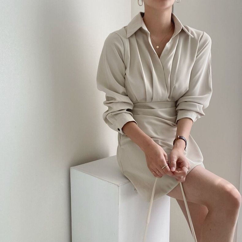 Polo領設計,優雅俐落💼收腰剪裁,凸顯曲線💃褶皺裙擺,細節滿分✨一件搞定,氣質百搭💕混棉面料