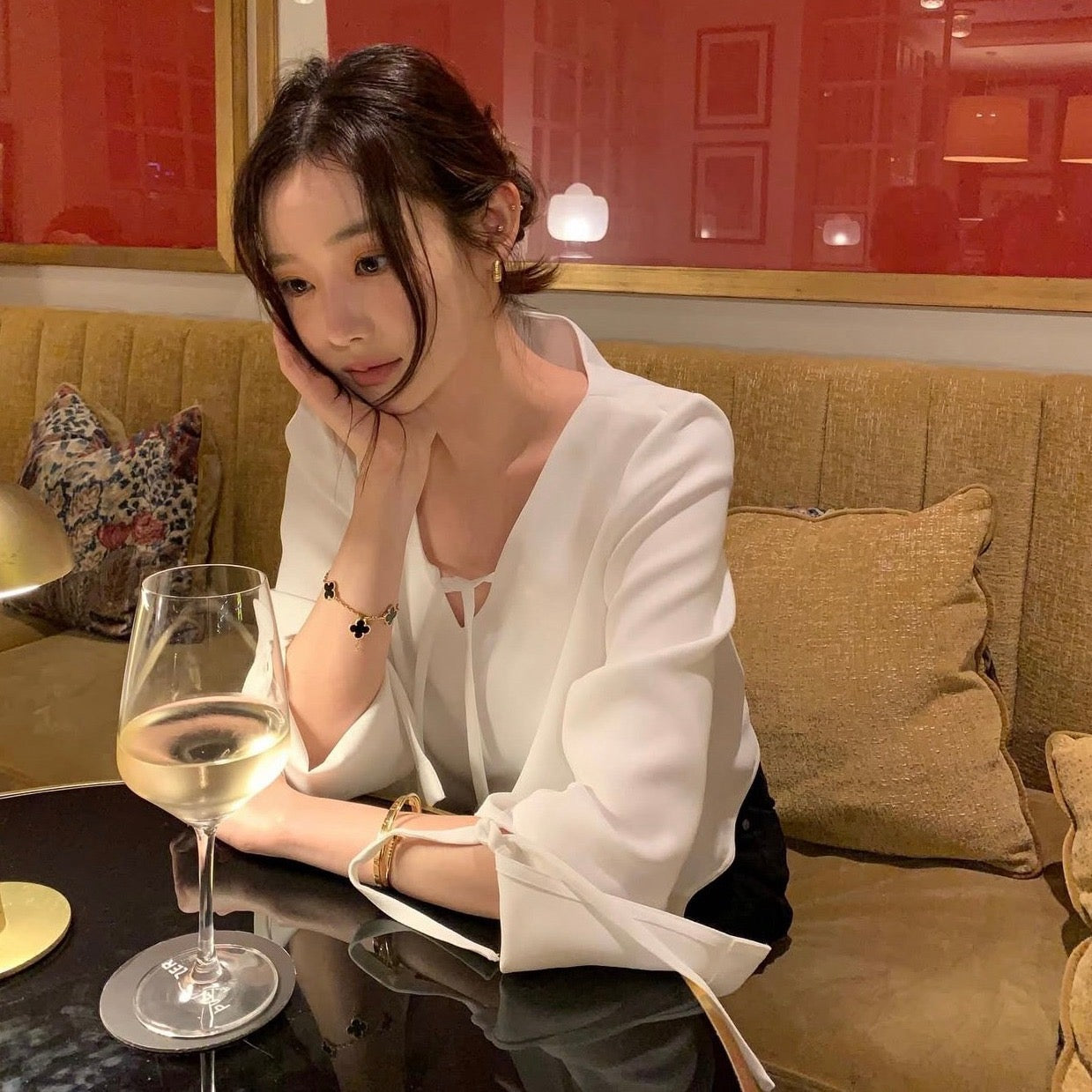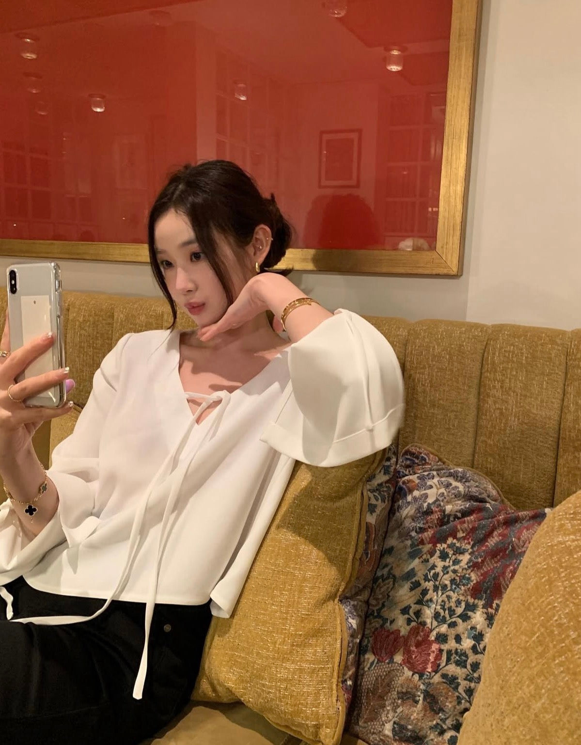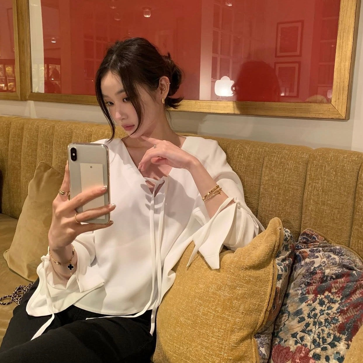 清爽雪紡垂墜感😘V領修飾臉型綁帶增添精緻感日常通勤都能穿雪紡面料