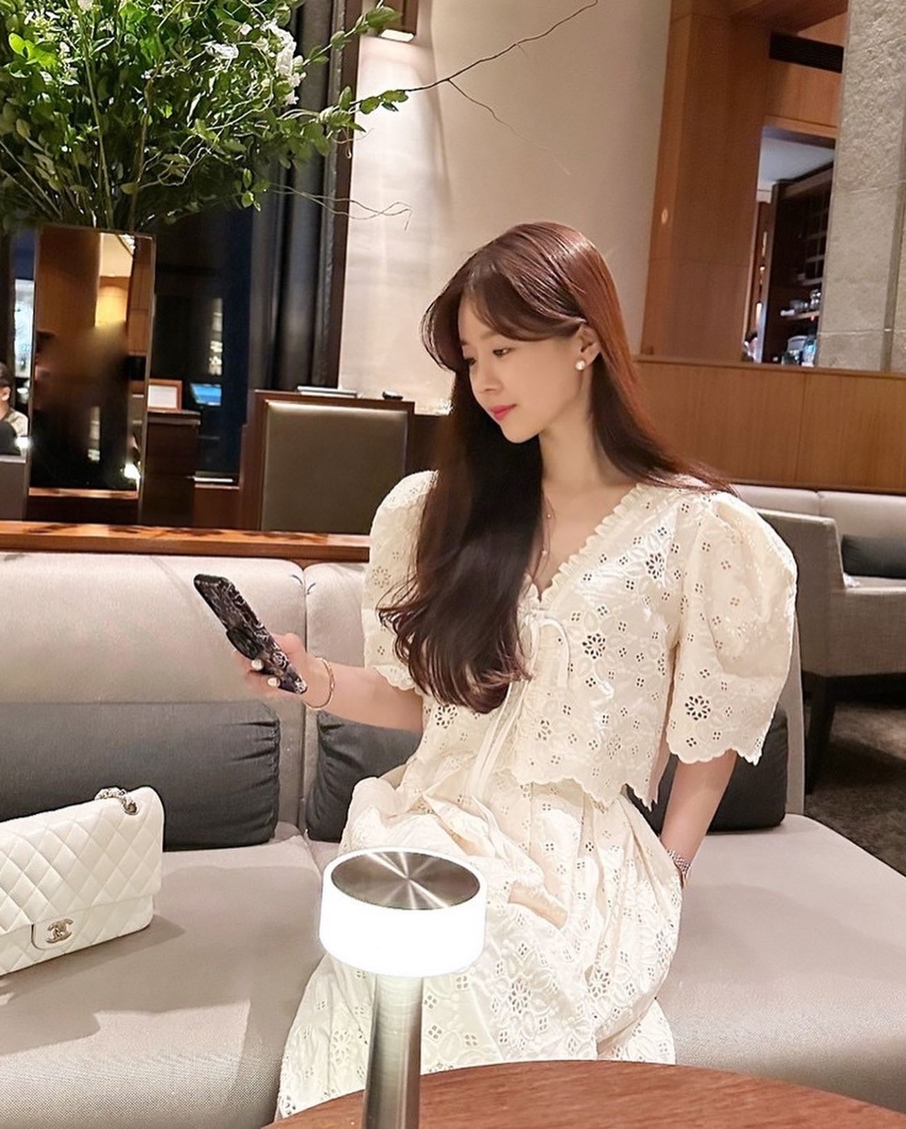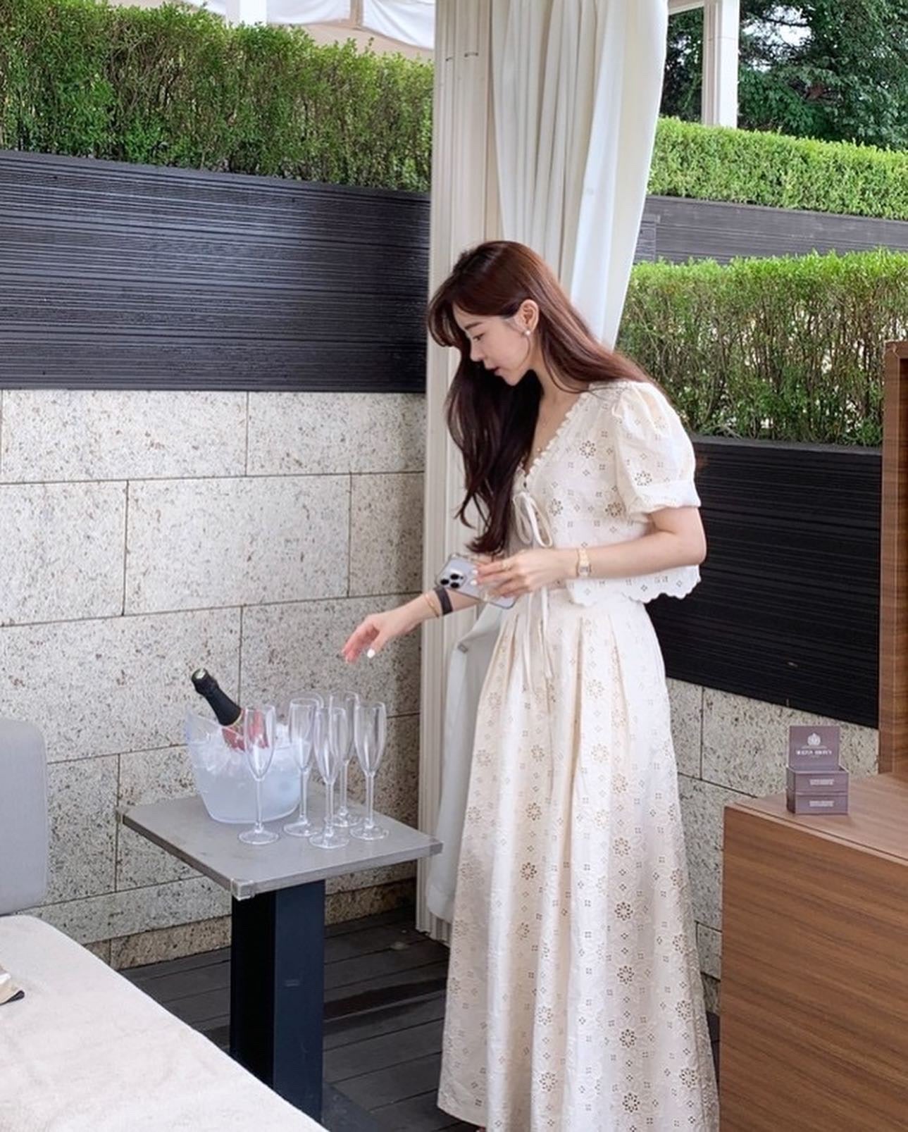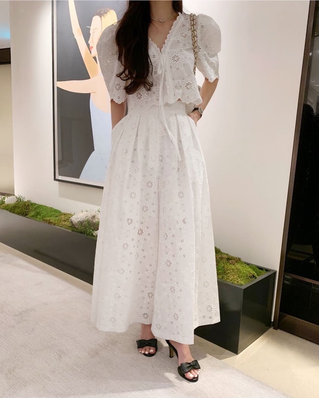 鏤空花邊刺繡上衣+壓褶半身裙套裝