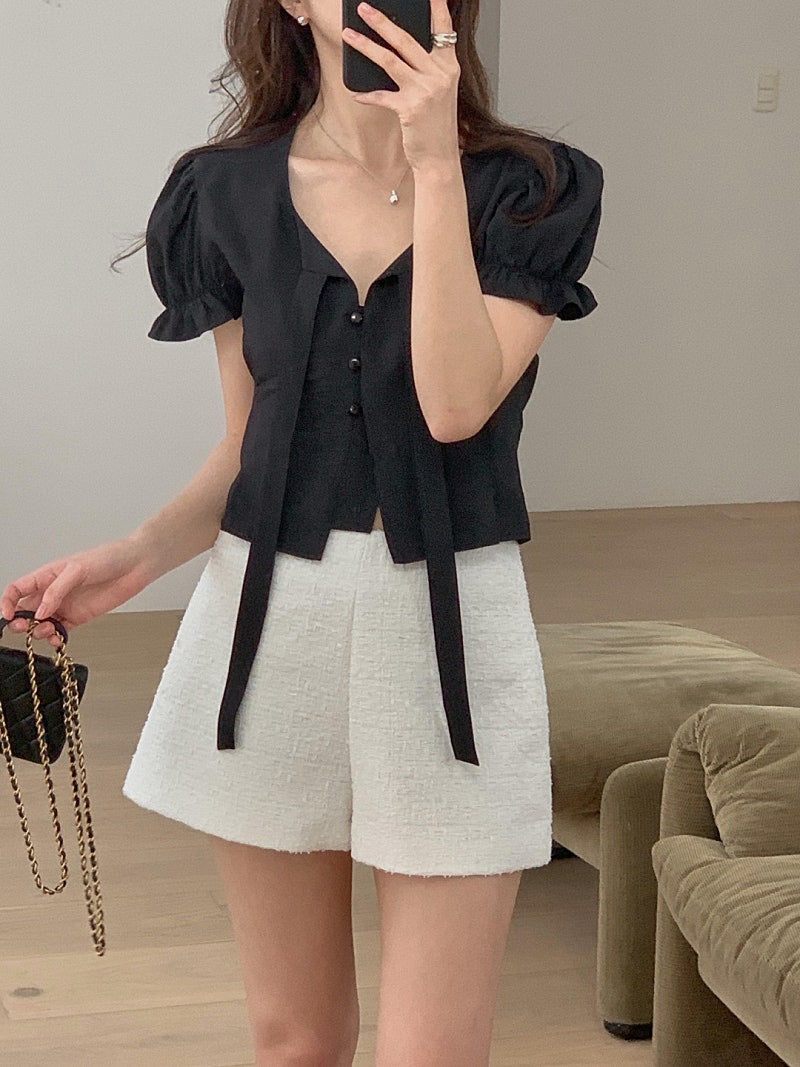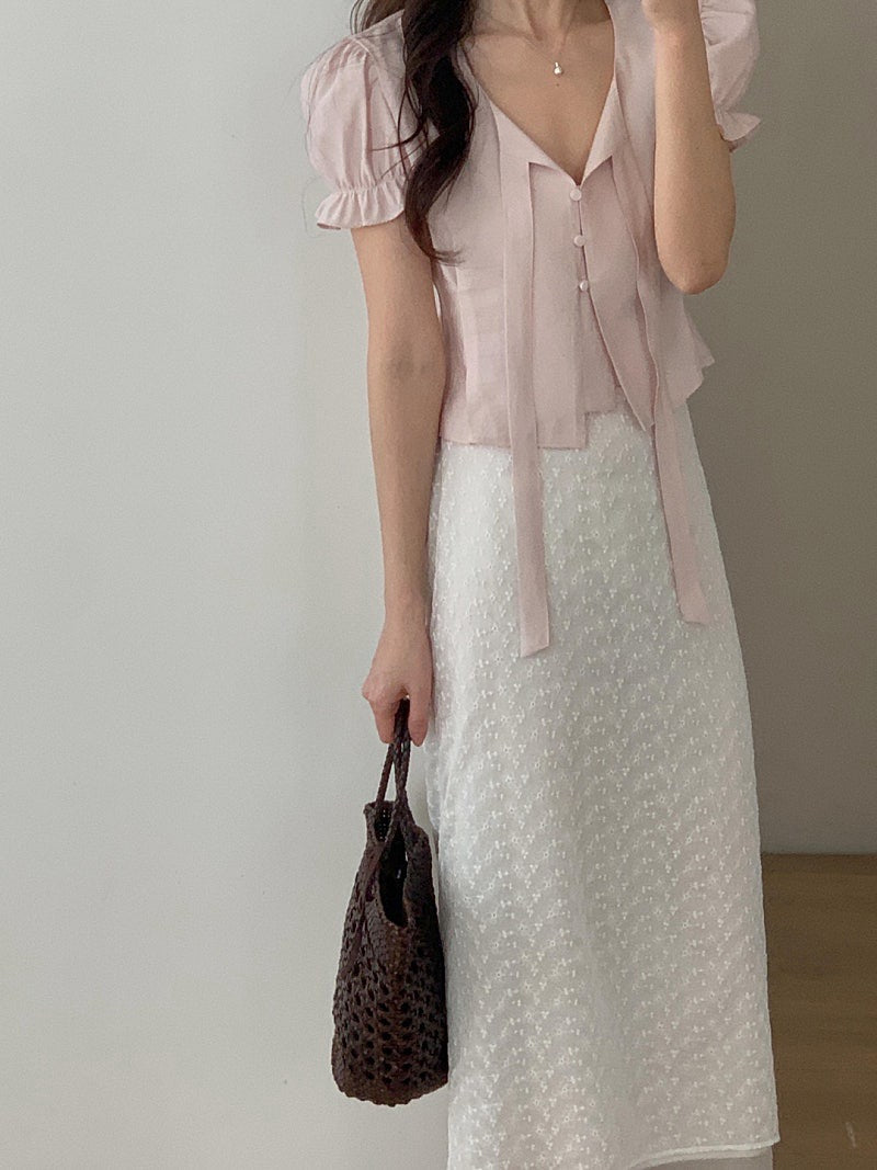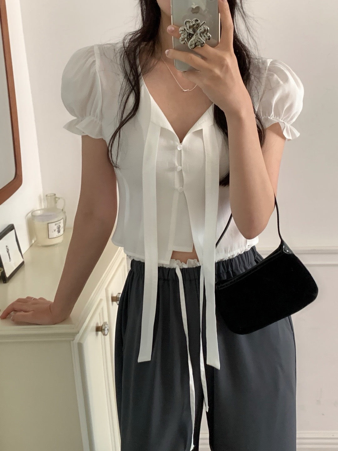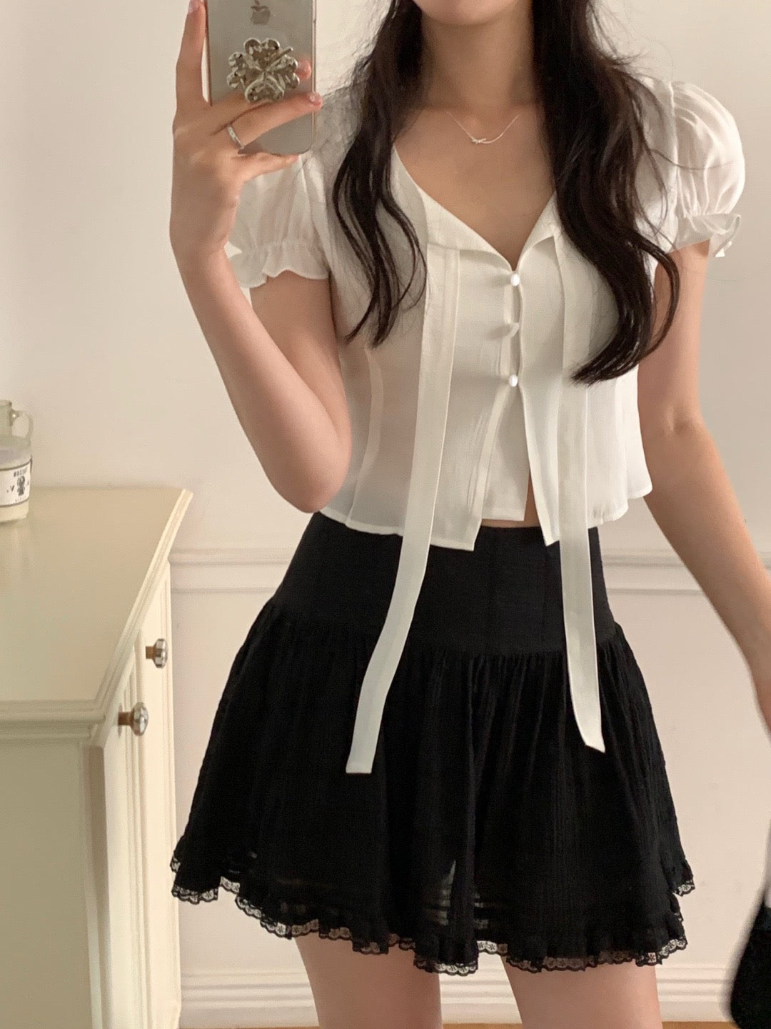 甜美泡泡袖+木耳邊設計🎀修飾手臂線條,同時增添層次感微寬鬆剪裁,穿起來更舒服😍日常穿搭、約會都好適合!滌綸面料