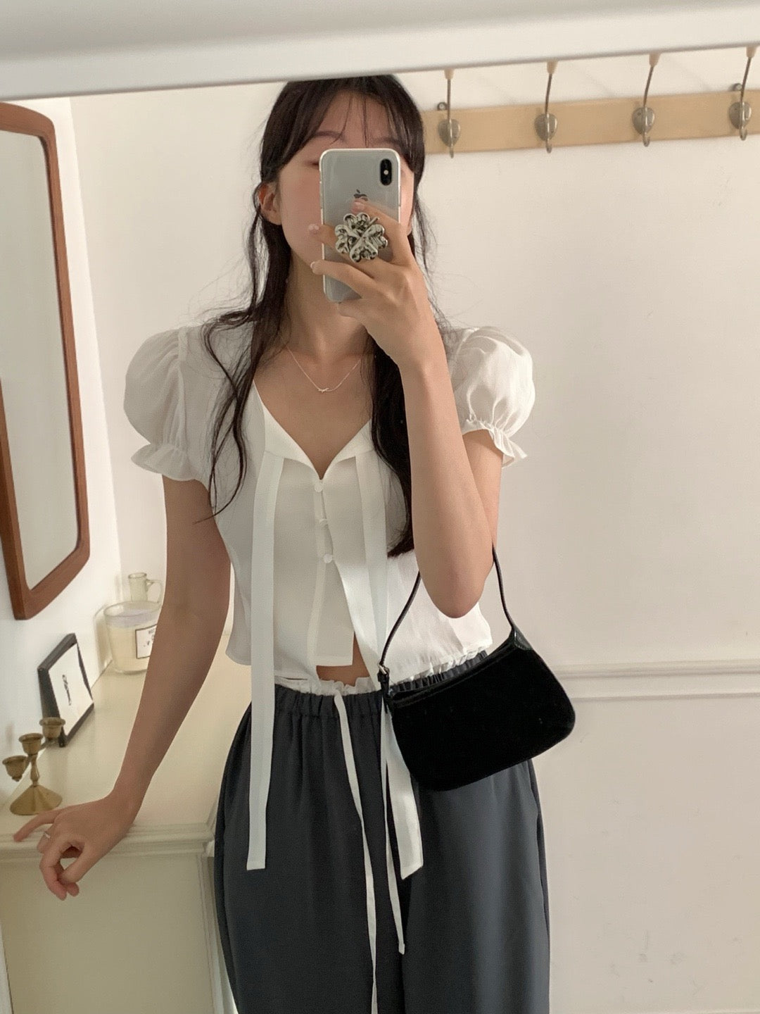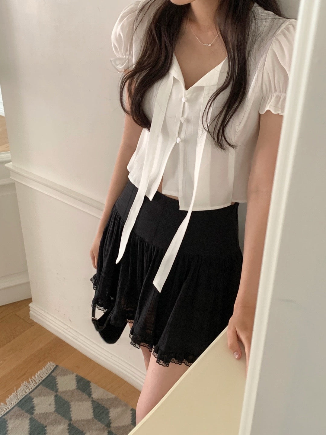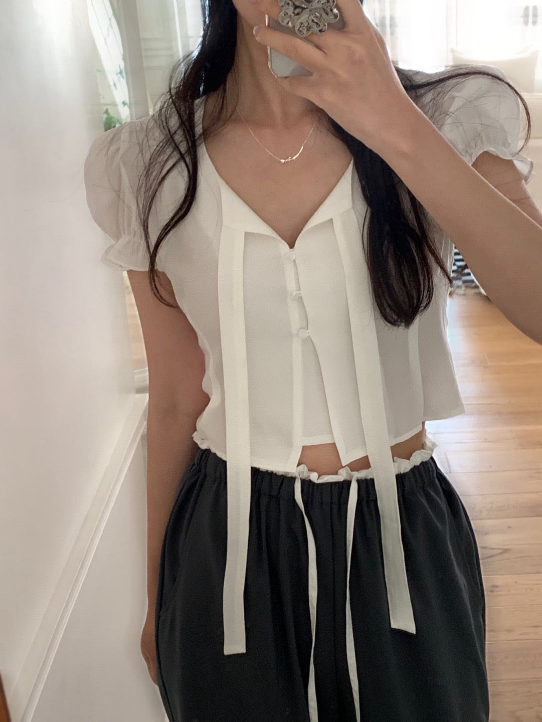甜美泡泡袖+木耳邊設計🎀修飾手臂線條,同時增添層次感微寬鬆剪裁,穿起來更舒服😍日常穿搭、約會都好適合!滌綸面料
