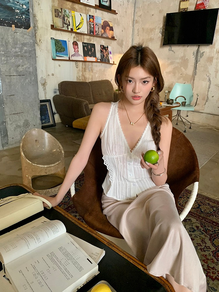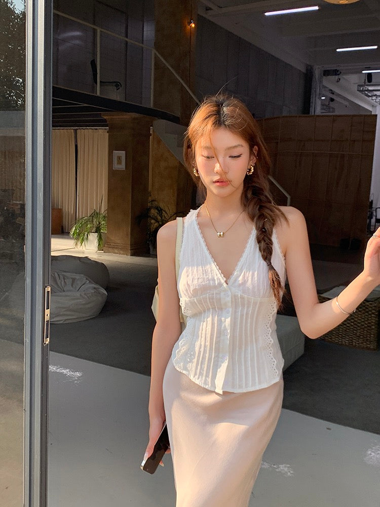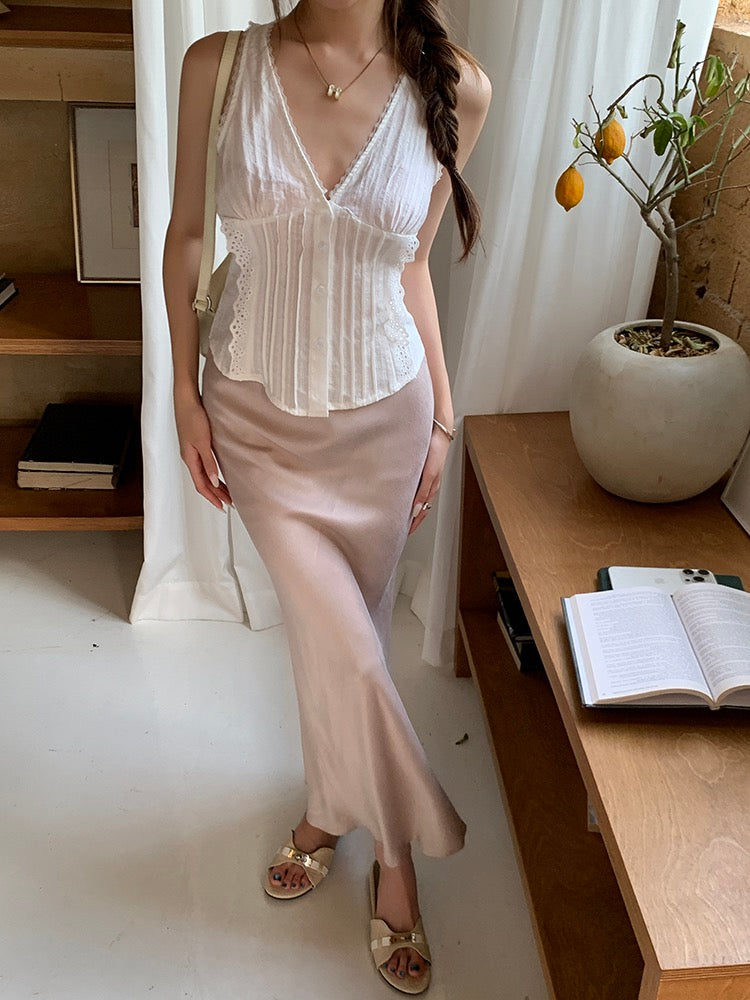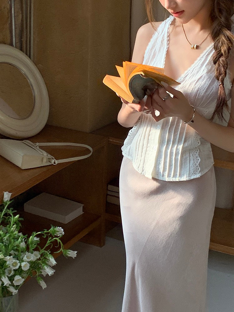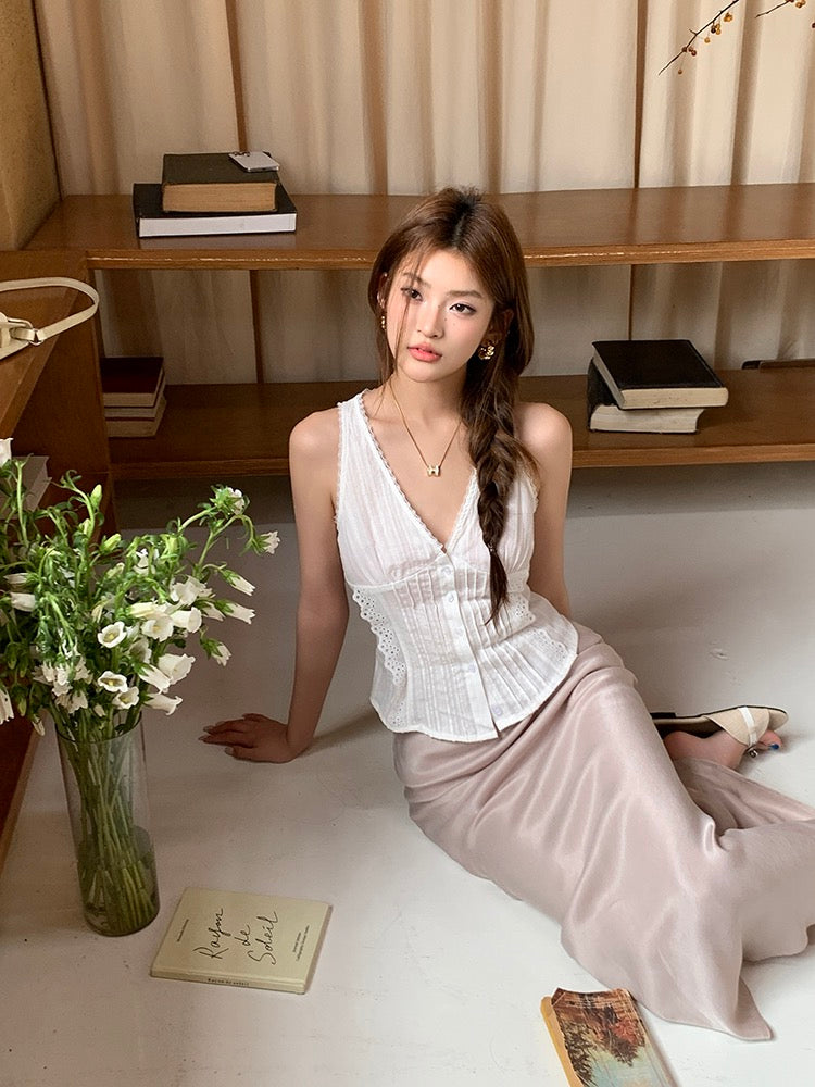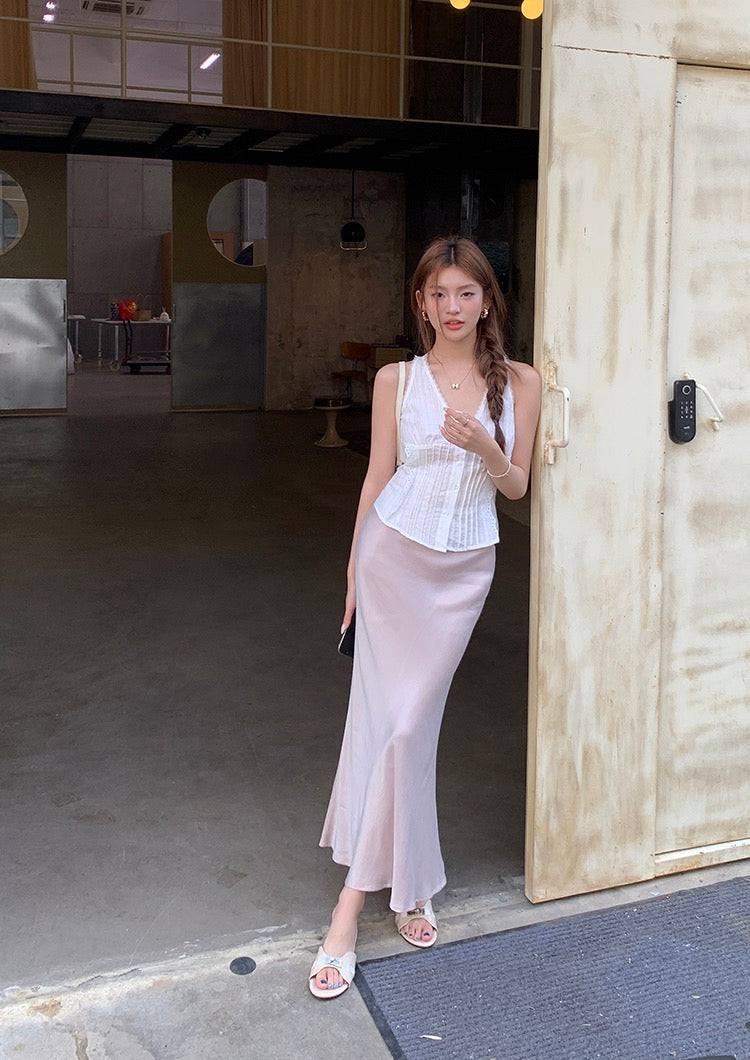 蕾絲花邊系帶背心+緞面修身包臀魚尾裙set